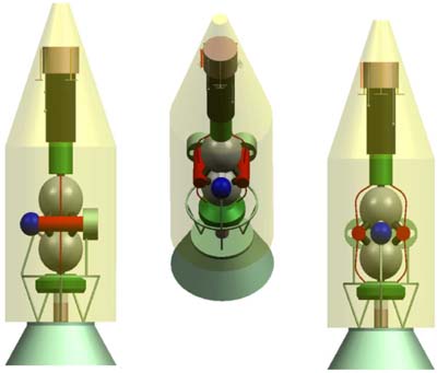 Figure 2: Three Views of Pluto-Kuiper Spacecraft in Launch Vehicle Shroud
